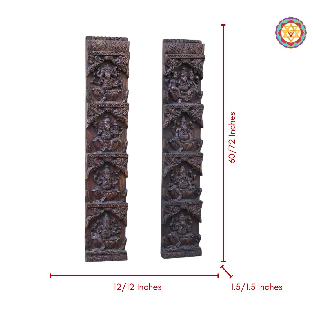 Invoke blessings of wisdom and prosperity with this vertical wooden wall panel featuring the eight divine forms of Lord Ganesha (Astaganesh). Expertly hand-carved in Vagai wood with a rich polished finish, this sacred panel is an ideal spiritual centerpiece for pooja rooms or gifting.