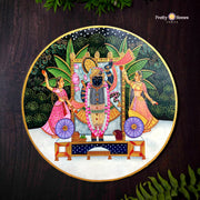 Round handpainted Pichwai-style wall plate featuring Shrinathji with Gopikas in a serene forest setting, inspired by traditional devotional art. A perfect blend of culture and spirituality.