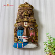 A stunning 18-inch handcarved wooden Vishnu mask adorned with intricate Krishna handpainting. This exquisite artwork showcases detailed craftsmanship and vibrant colors, making it a perfect statement piece for art collectors and decor enthusiasts.