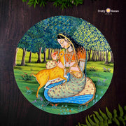 Round handpainted Pichwai wall plate depicting a graceful princess playing with deer in a lush forest setting, capturing the charm of royal Indian art. Ideal for ethnic and nature-inspired décor.