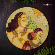 Round handpainted Pichwai-style wall plate featuring an aesthetic depiction of Flute Krishna with Radha, radiating divine love and grace. A timeless addition to spiritual and artistic décor.