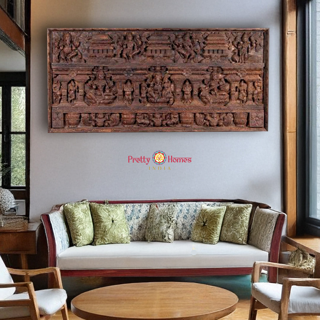 72” Large Handcrafted Wooden Ganesha, Lakshmi & araswati Panel – Traditional Design with Various Gods