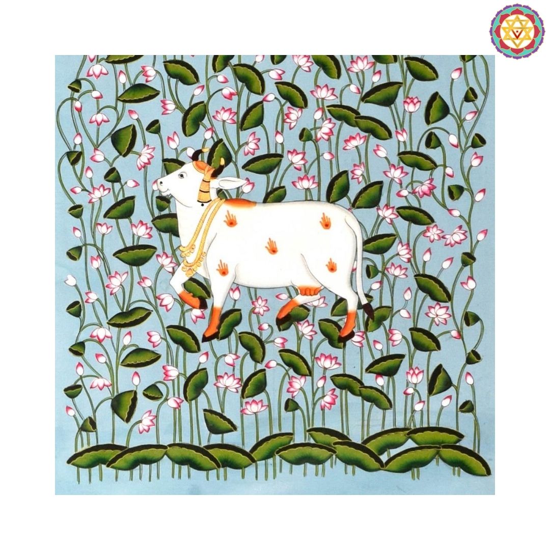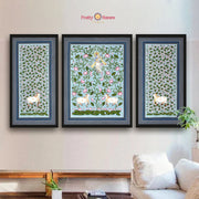 Blue Handpainted Pichwai Set of 3 – Featuring a serene lotus pond theme with Krishna at the center, this artwork beautifully captures divine elegance. Perfect for spiritual wall décor and traditional Indian home interiors.