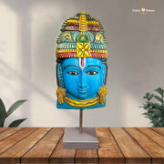 Hand-Carved Wooden Vishnu Mask on Stand – Intricately crafted tabletop décor capturing the divine grace of Lord Vishnu, perfect for spiritual and artistic spaces.