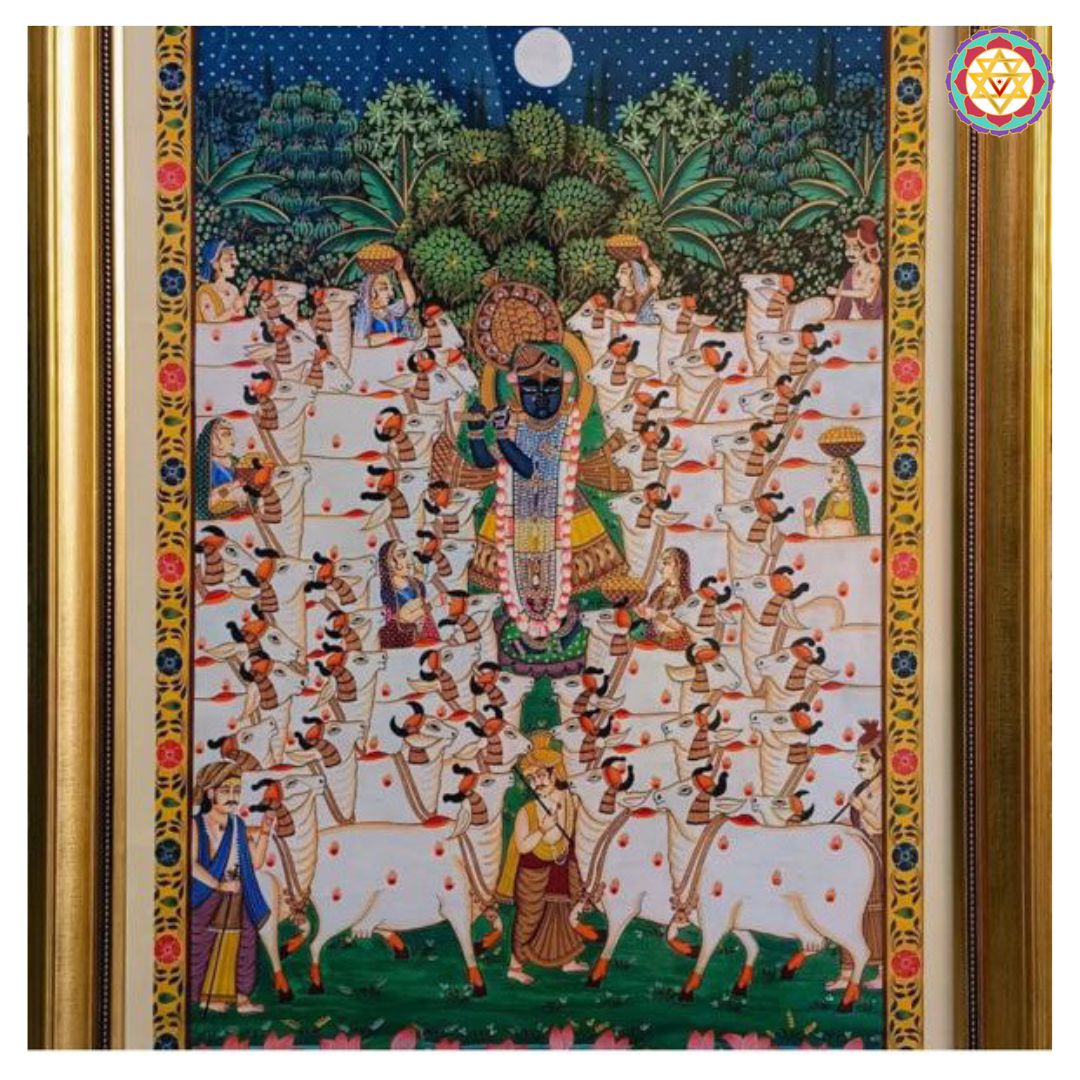 Richly detailed, this handpainted Pichwai reflects the cultural essence and spiritual beauty of the celebration.