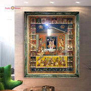 Celebrate divine opulence with this exquisite Handpainted Pichwai – Raj Bhog Swaroop of Shrinathji in a vintage finish. Depicting the deity in his royal adornment during the grand Raj Bhog offering, this artwork is crafted with intricate details and muted, timeless tones. A perfect blend of devotion, heritage, and traditional artistry for your home or gifting.