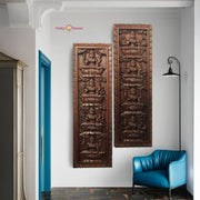 Handcarved in rich detail, this large vertical wooden panel features the eight forms of Goddess Lakshmi, symbolizing wealth, wisdom, courage, and fertility.