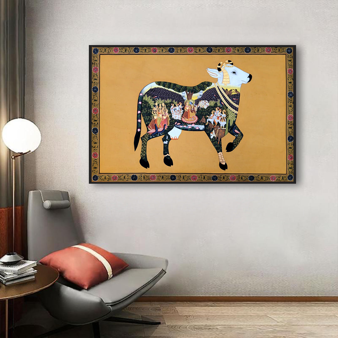 pichwai - Handpainted kamdhenu pichwai with Krishna Leela detailings