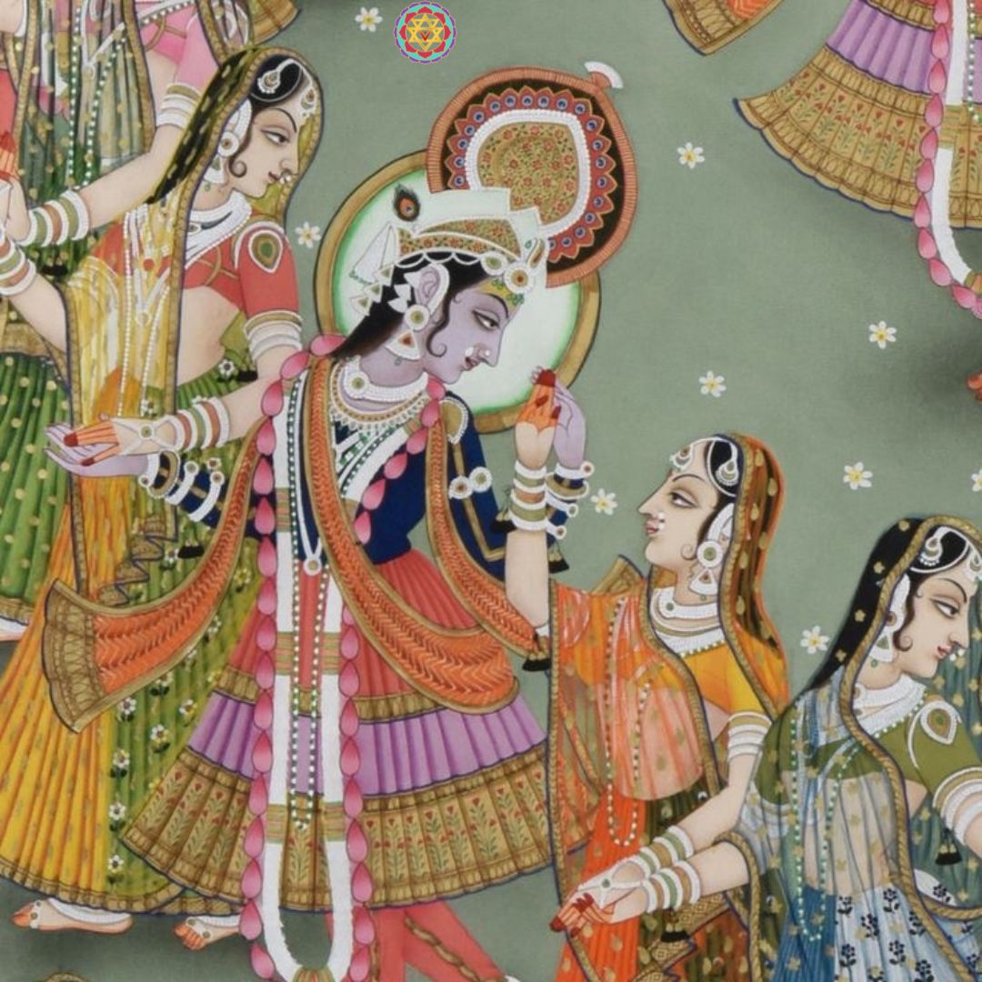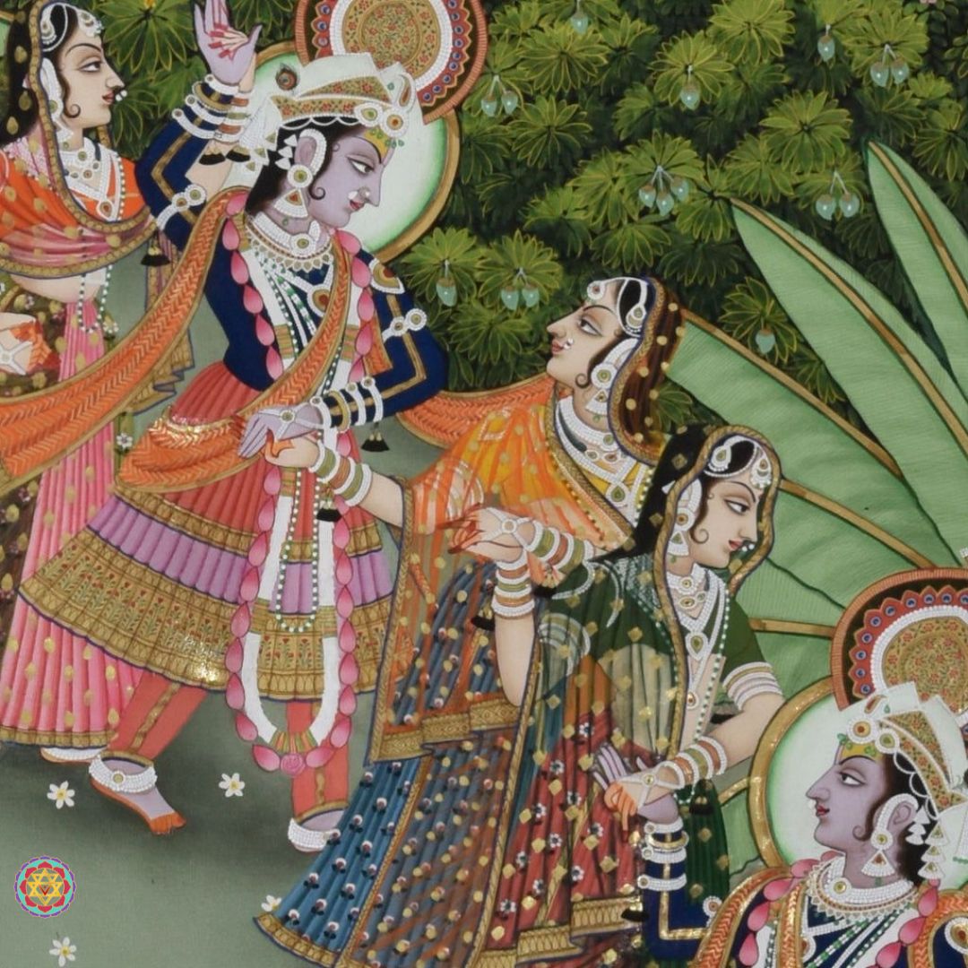 Overview: This radiant Pichwai painting captures the divine Raas Leela — Lord Krishna dancing with Radha and the Gopis beneath a full moon. It celebrates love, joy, and eternal devotion, transforming your space into a sanctuary of divine art.