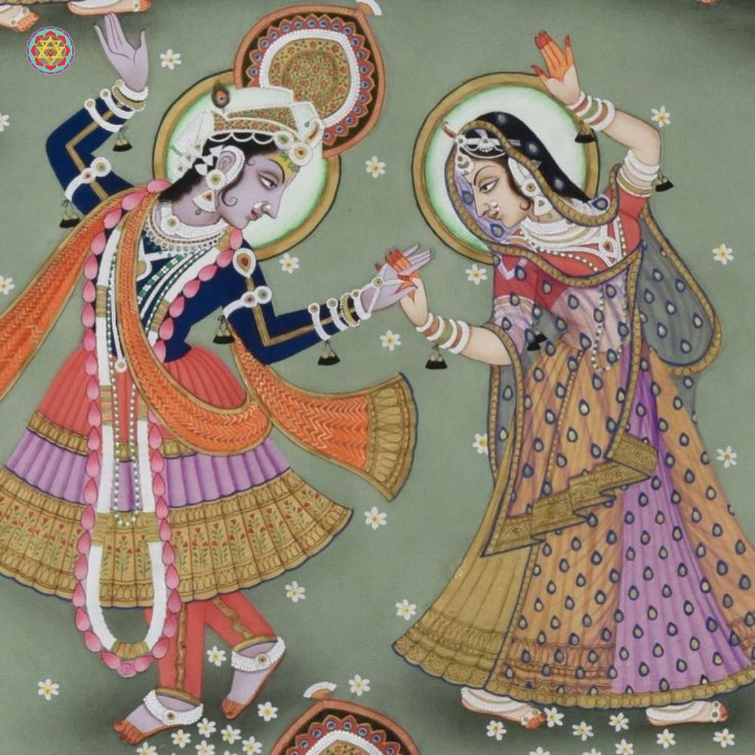 Design & Storytelling: The composition portrays rhythmic symmetry, with Krishna at the center surrounded by Gopis in vibrant attire. The background, filled with moonlit lotuses and temple foliage, glows with warmth and spirituality. The painting’s colors and detailing bring movement and emotion to life.