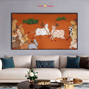 In Pichwai art, cows represent divine care and Krishna’s compassion. The rustic charm and antique color palette allow this piece to complement both classic and modern interiors beautifully.