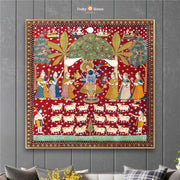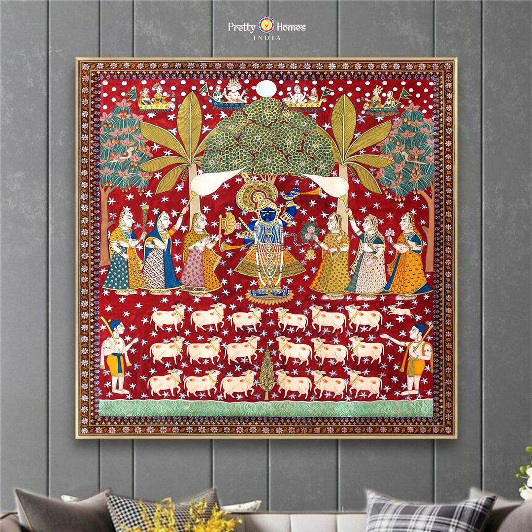 Celebrate Indian heritage with this vintage style hand painted Shrinathji pichwai painting, beautifully depicting Shrinathji with Gopikas and sacred cows. The detailed composition and vibrant colors capture the essence of traditional pichwai artwork, making it a timeless addition to any art collection.