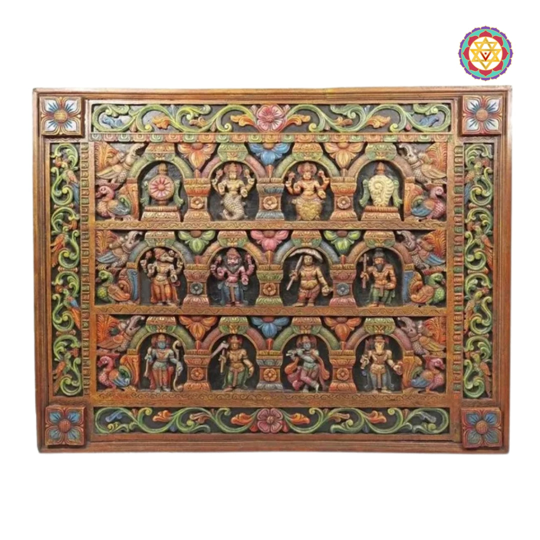 This grand dashavatar wooden panel showcases all ten incarnations of Lord Vishnu in a beautifully carved, square-format wall piece. Sculpted from a single block of Vagai wood and painted in vibrant multicolour, this panel celebrates divine protection and traditional artistry in one monumental work.