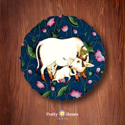 This handcrafted pichwai wall plate captures a tender moment between a cow and her calf, symbolizing care and serenity. Set against a deep blue backdrop of blooming lotuses and shaped like a delicate flower petal, the design brings together both softness and strength. Perfect for those who value Indian tradition and artisan-made décor, this piece of pichwai artwork is sure to warm hearts and elevate any space.