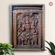 Elevate your space with this majestic vertical wooden panel featuring Lord Shiva and Goddess Parvati seated gracefully on Nandi. Inspired by traditional Chola-style temple art, this wall hanging showcases intricate carvings of vines, peacocks, and floral motifs around the central deities.