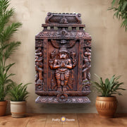 This finely detailed vertical wooden wall panel showcases Lord Hanuman in a blessing posture, intricately hand-carved in traditional Chettinad gopuram style. A magnificent wall mount and statement piece, it brings strength, devotion, and protection into your home.
