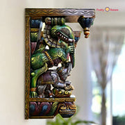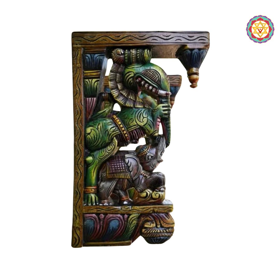 This 18″ hand-carved corbel pairs a fierce yali with a gentle elephant — a classic temple-style wall bracket that adds architectural drama to doorways, mantels, or pooja alcoves. The carving is done in Vagai wood and finished in multicolour to highlight the relief work.